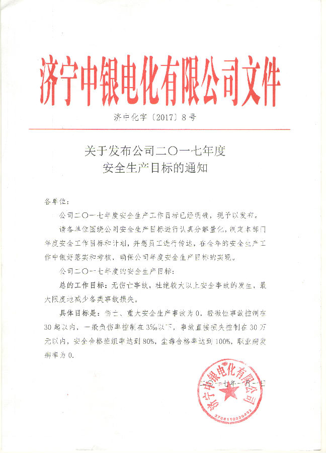 关于印发公司2017年度安全生产目标的通知……